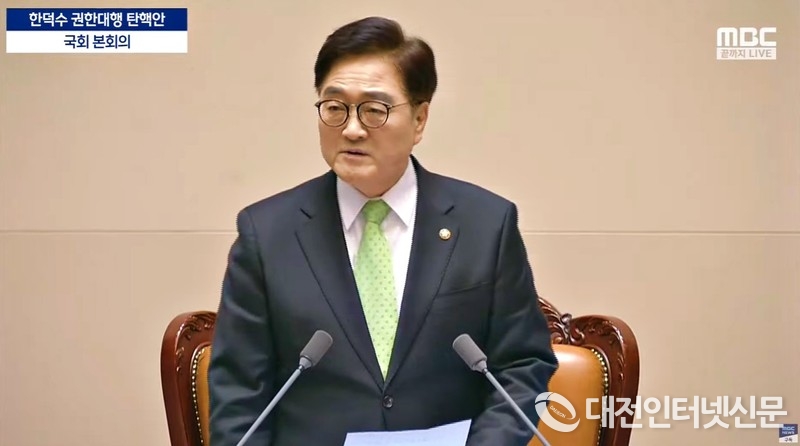 27일 우원식 국회의장이 한덕수 권한대행에 대한 탄핵안 가결을 선포하고 있다. [사진-mbc 유튜브 갈무리]