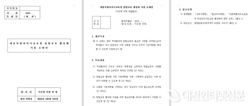 세종시 교육청이 이순열 의원의 학생 헌법교육 활성화 지원조례에 대한 교육청의 입장을 밝혔다. [사진-대전인터넷신문]
