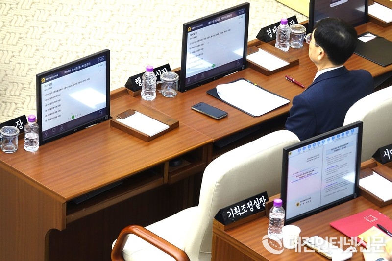 결국 최 시장 없는 본회의가 오후 1시에 속개된 채 현안질문 없는 5분 자유발언으로 진행되고 있다. [사진-대전인터넷신문]