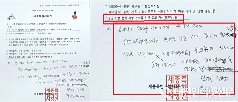 제97회 세종특별자치시의회 임시회 제2차 본회의가 열린 6일, 당초 시장을 상대로 긴급현안질문이 예정됐던 김현옥 의원은 “최민호 세종시장이 당초 일정에도 없던 행사를 본인이 자청하고 그 이유를 들어 이석을 요청하는 공문을 의회 사무처 직원 모두가 퇴근한 6시 50분경 공문을 보낸 것은 시장이 민의의 전당인 세종시의회를 기만하는 것이다”라며 “특히 불참 사유로 공문에 기재된 ‘중앙-지방 협력 사항논의를 위한 회의 참석(행정안전부)은 행안부 질의 결과 대통령탄핵 사건으로 일정이 취소된 회의이며 최 시장이 참석을 이유로 이석을 요구한 회의는 지방시대 워크숍에 참석해서 하는 인사말로 미리 사전에 일정을 기획한 의사일정에 비춰 중요하지 않다”라는 이견이다.