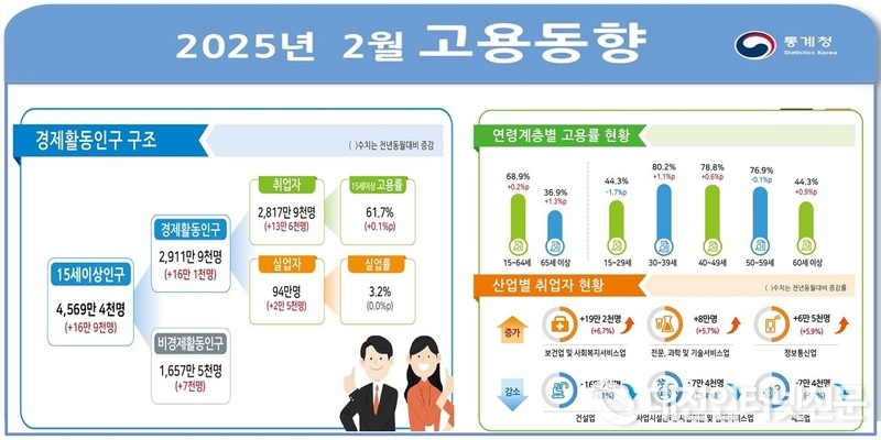 통계청이 발표한 2025년 2월 고용동향에 따르면 15세 이상 인구는 전년 동월 대비 16만 9천명 증가한 4,569만 4천명으로 나타났고 이 중 경제활동인구는 16만 1천명 증가한 2,911만 9천명, 비경제활동인구는 7천명 증가한 1,657만 5천명인 가운데 취업자는 13만 6천명 증가한 2,817만 9천명, 실업자는 94만명(2만 5천명 증가)이 증가하면서 15세 이상 고용률은 61.7%, 실업률 3.2%를 기록했다.