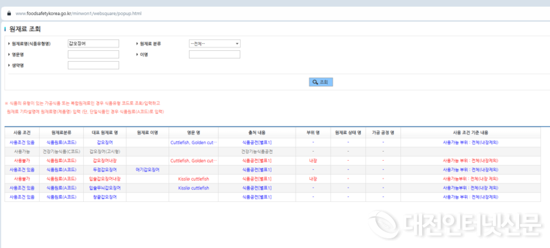 원재료 검사 식약처 원재료 검색 갑오징어 내장 뼈 불가 식품 에이 코드