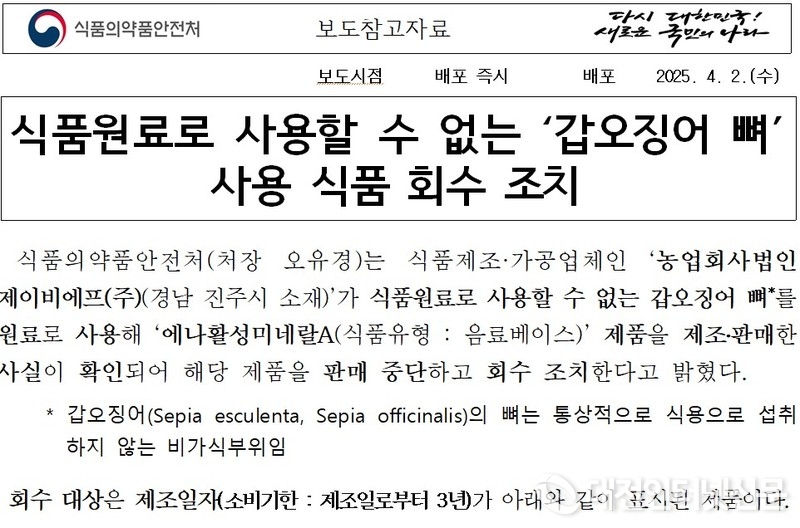 식약처는 지난 4월 2일 자 보도자료 배포를 통해 식품제조·가공업체인 ‘농업회사법인 제 이비에프(주)(경남 진주시 소재)가 식품 원료로 사용할 수 없는 갑오징어 뼈를 원료로 사용해 ’에나활성미네랄A(식품 유형:음료 베이스) 제품을 제조·판매한 사실이 확인되어 해당 제품을 판매중단하고 회수 조치한다고 밝힌 바 있다. 아울러 갑오징어(Sepia esculenta, Sepia officinalis)의 뼈는 통상적으로 식용으로 섭취하지 않는 비가식 부위라고 첨부했다.