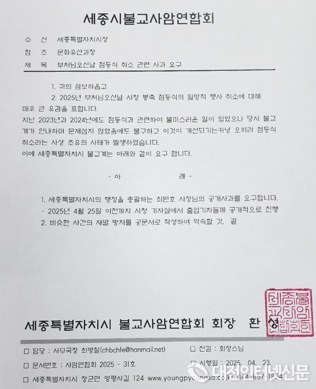 이에 세종시 불교사암연합회(회장 환성 스님)는 4월 25일 이전에 시청 기자실에서 출입 기자를 상대로 행정을 총괄하는 최민호 시장의 공개 사과와 비슷한 사건의 재발 방지를 공문으로 작성 약속할 것을 요구했으며 종무를 총괄하는 국장과 과장이 23일 사업연합회 회장 스님(환성:영평사 큰 스님)을 만나 담당자의 미숙한 업무처리에 대해 사과하고 재발 방지를 위한 약속을 하면서 사태는 일단락되었지만 시청을 향한 불만 섞인 불심은 아우르질 못했다는 지적이다.