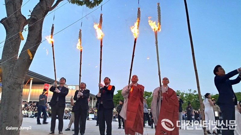 불기 2569년 부처님오신날 봉축 법요식이 세종 중앙공원 일원에서 봉행 됐다. 사진은 낙화 점등하는 내빈 [사진-대전인터넷신문]