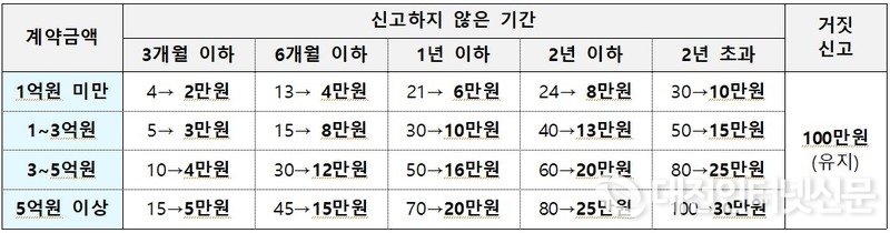 신고의무 위반시 과태료 기준 완화(부동산거래신고법 시행령 별표3)