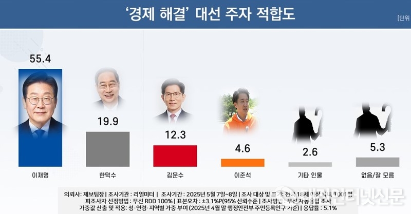 [대전인터넷신문=세종/최대열기자] 오는 6월 3일 제21대 대통령 선거가 치러질 예정인 가운데, 응답자의 정치 성향이나 지지 여부와 무관하게 경제 문제를 잘 풀어갈 차기 대통령으로 누가 가장 적합하다고 여기는지 물은 결과, 더불어민주당 ‘이재명’ 후보가 과반인 55.4%로 가장 높게 나타났고 다음으로 무소속 ‘한덕수’ 전 총리 19.9%, 국민의힘 ‘김문수’ 후보 12.3%, 개혁신당 ‘이준석’ 후보 4.6%로 조사됐다. (‘기타 인물/없음/잘 모름’은 각 2.6%, 4.1%, 1.2%)
