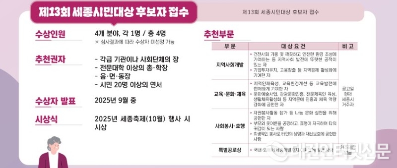 이번 제13회 세종시민대상은 ▲지역사회개발 ▲교육·문화·체육 ▲사회봉사·효행 ▲특별공로상 등 4개 부문에서 각 부문별 수상자를 선정할 계획이다. 후보자는 공적이 현저한 인물로 세종시에 거주해야 하며, 특별공로상 부문은 거주 제한이 없다.