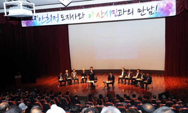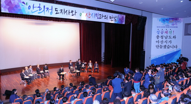 안 지사는 이날 복기왕 아산시장과 도의회 의원, 아산시의회 의원, 기관장 등과 환담을 가진 뒤, 시청 시민홀에서 지역 기관·단체장 등 지도자 400여명과 소통의 시간을 가졌다.