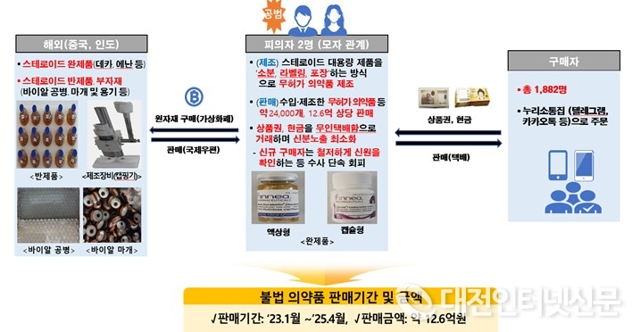 [대전인터넷신문=세종/최대열기자] 식품의약품안전처는 무허가 스테로이드·성장호르몬 등을 직접 제조해 SNS를 통해 유통하고, 12억 6천만 원 상당의 불법 의약품을 판매한 일가족을 적발해 아들을 구속하고 어머니를 불구속 송치했다고 22일 밝혔다.