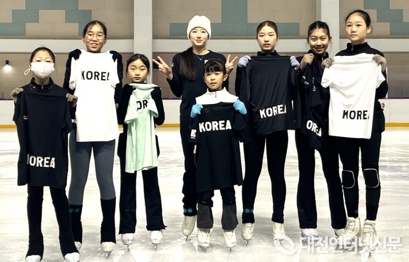 이혜인 선수의 유니폼을 전달받은 세종시 피겨스케이팅 꿈나무들이 환화게.... [사진-세종시체육회]
