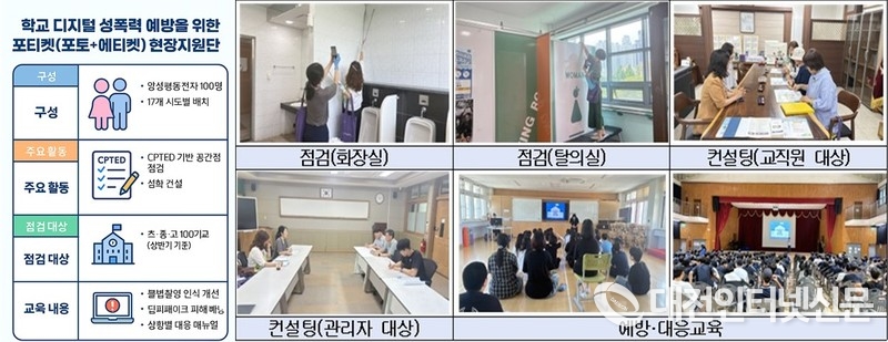 지원단은 학교 내 화장실·탈의실·샤워실 등 디지털 성폭력에 취약한 공간에 대해 범죄예방 환경설계(CPTED) 기반의 체크리스트를 활용해 점검을 실시하고, 필요하면 심화 컨설팅을 통해 현장 중심의 개선 방안을 제시했다.