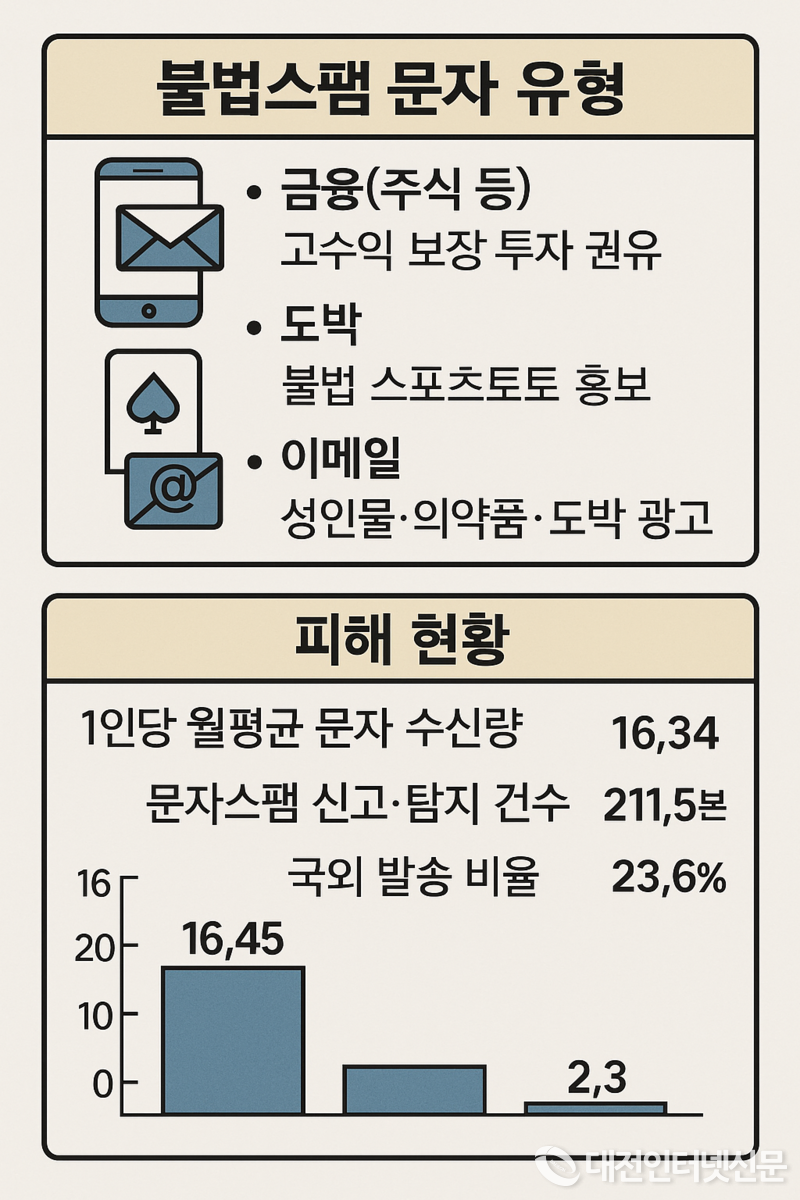 [대전인터넷신문=세종/최대열기자] 방송통신위원회가 불법스팸 발송자의 ‘번호 갈아타기’ 수법을 원천 차단하는 제도를 도입한다. 동시에 금융·도박 중심의 불법스팸 피해가 올 상반기 역대 최고치를 기록한 것으로 나타났다.