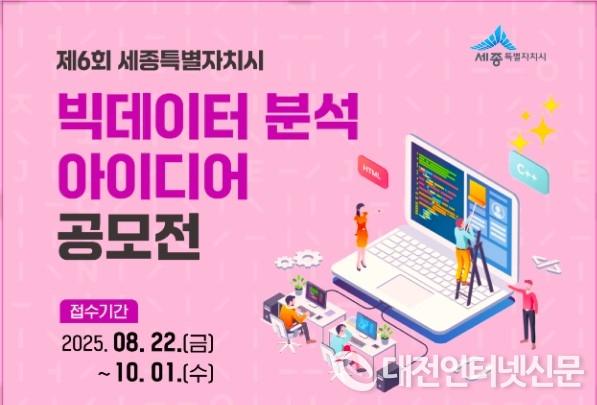 [대전인터넷신문=세종/권혁선 기자] 세종시는 22일부터 10월 1일까지 ‘제6회 빅데이터 분석 아이디어 공모전’을 열고, 시민과 국민이 제안하는 창의적 아이디어를 통해 도시문제 해결과 빅데이터 활용 정책을 발굴한다고 밝혔다.