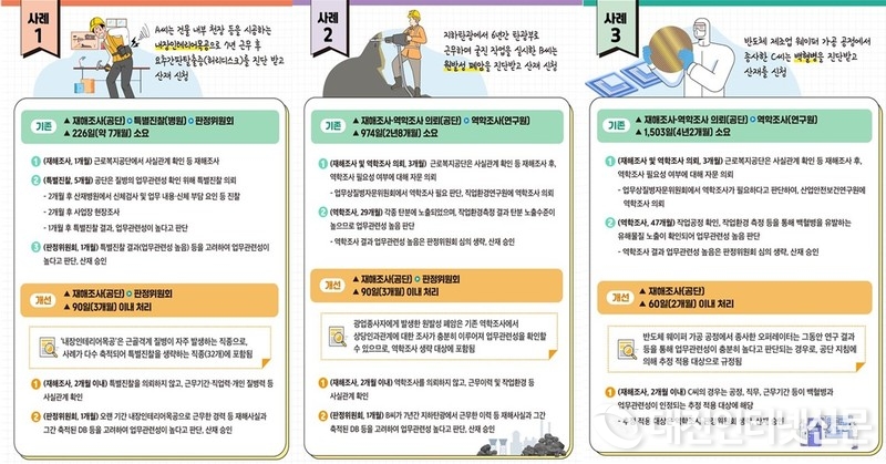 또한, 광업 종사자의 원발성 폐암, 반도체 제조업 종사자의 백혈병처럼 인과관계가 연구로 입증된 질환은 역학조사 절차를 생략한다. 충남 보령 광산 노동자, 세종·청주 반도체 종사자 등 충청권 고위험 직군에도 처리 기간 단축 효과가 기대된다.