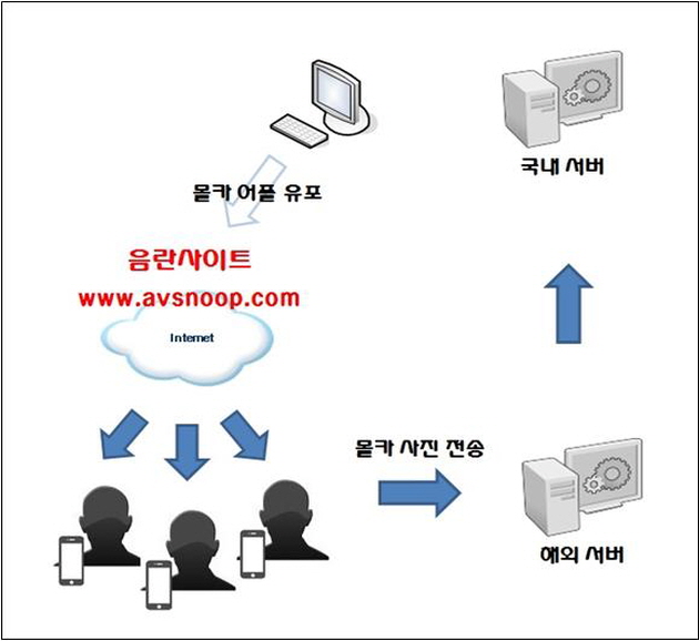 몰카 `앱´을 이용하여 촬영한 사진은 숨김 폴더에 저장되어 촬영현장에서 몰카 촬영 사실을 확인하기 어렵도록 하였고, 개발자가 관리하는 서버로 몰래 전송되도록 제작되었다.
