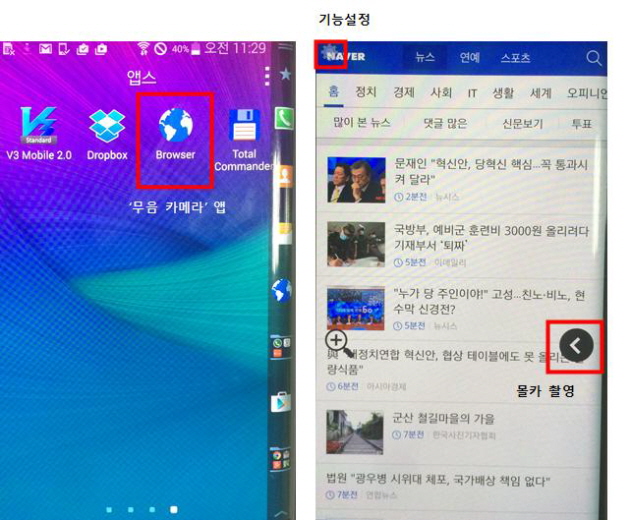 - 몰카 `앱´은 무음 및 자동 초점조절 기능이 탑재되어 있고, 활성화시 휴대폰 화면에는 포털사이트 뉴스 페이지와 카메라 조작 버튼(설정, 줌, 촬영)이 현출되며