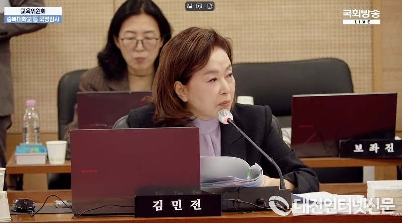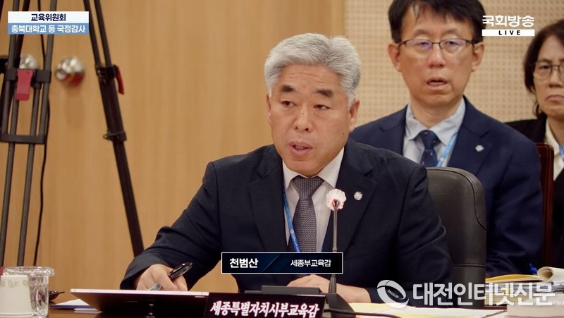 23일 충북대학교에서 열린 국회 교육위원회 국정감사에서 김민전 의원의 질문에 천범산 세종시부교육감이 답변하고 있다. [사진-국회방송 유튜브 갈무리]