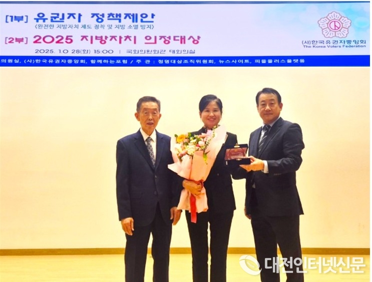 [대전인터넷신문=세종/권혁선 기자] 세종시의회 여미전 의원(더불어민주당)이 지방자치 발전과 시민 복지 증진에 기여한 공로로 (사)한국유권자중앙회가 주관한 ‘2025 지방자치 의정대상’을 수상했다. 이번 시상식은 10월 28일 국회의원회관에서 열렸다.