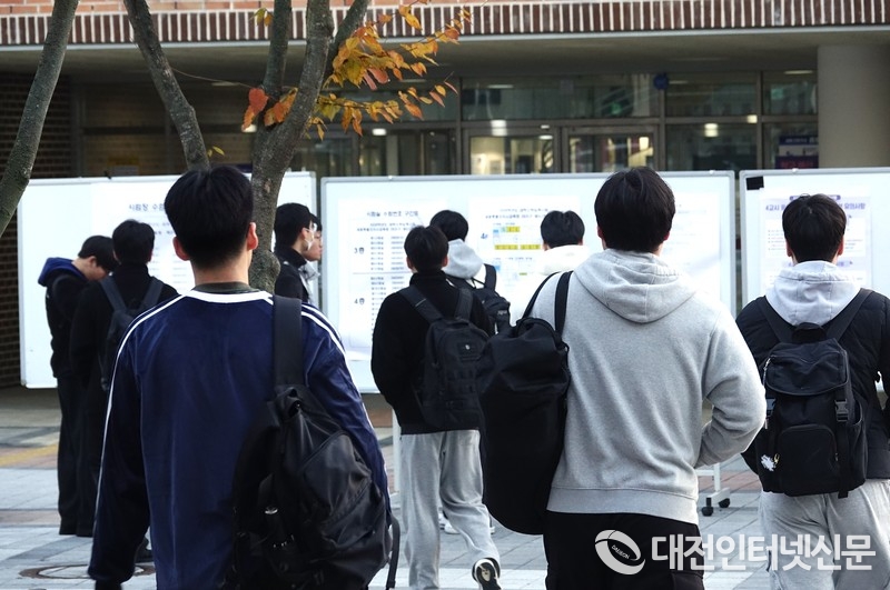 나의 수험장은 인딘고? 입실 전 수험장에 도착한 수험생들이 자시이 치뤄야할 수험장을 확인하는 모습. [사진-대전인터넷신문]