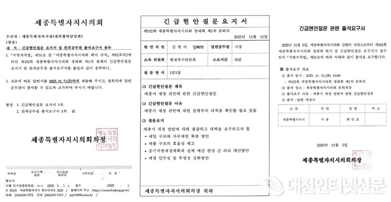 또한 “긴급현안질문은 세종시 재정구조를 점검하기 위한 필수 의정활동”이라며 “시장 측이 절차 문제를 이유로 발언을 제지한 것은 합법적 의정 절차를 부정한 행위”라고 강조했다.