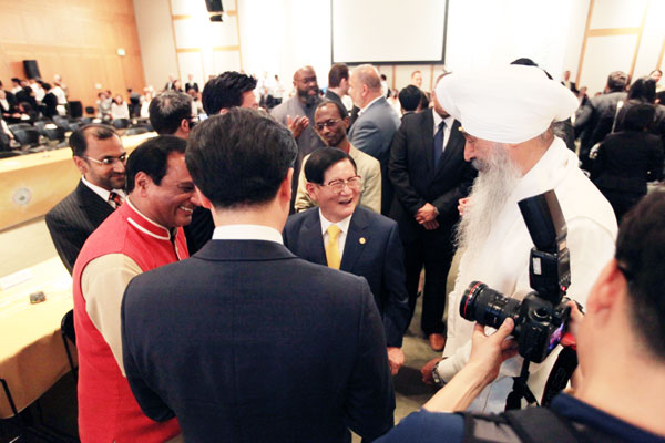 | ▲ HWPL 이만희 대표가 10일(현지시간) 미국 로스앤젤레스 세리토스에서 `평화의 빛 발전회의´를 마치고 미국 서부지역 시크교 최고 지도자인 바하이 사힙 샅폴 싱 칼사 종교지도자와 대화를 나누고 있다. (사진제공 하늘문화세계평화광복) |