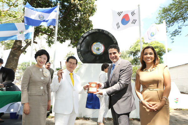 | ▲ HWPL 이만희 대표(좌측에서 두 번째)가 엘살바도르 산타테크클라시의 로베르토 시장에게 평화감사패를 받고 있다. (사진제공 하늘문화세계평화광복) |
