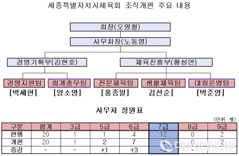 세종시체육회가 2026년도 예산 심의가 진행 중에 의회에 제출한 조직예산과 달리 1부 1팀을 추가 확대하는 조직개편안을 단행하면서 의회 예산 심사권 침해 논란의 중심에 섰다. [대전인터넷신문]