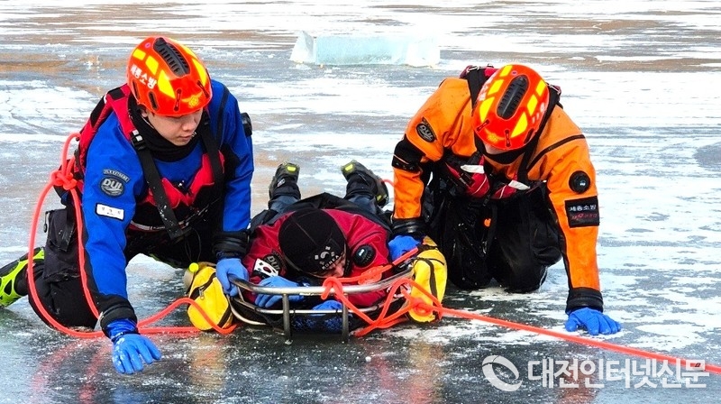 훈련은 얼음 두께 약 50㎝ 이상으로 결빙된 수역에서 진행됐다. 구조대원들은 동력 절단 장비를 활용한 얼음 절단, 얼음 아래 수중 수색, 지상과 수중 간 통신을 활용한 합동 구조 전술을 반복 숙달하며 실제 사고 상황을 가정한 대응 훈련을 수행했다.