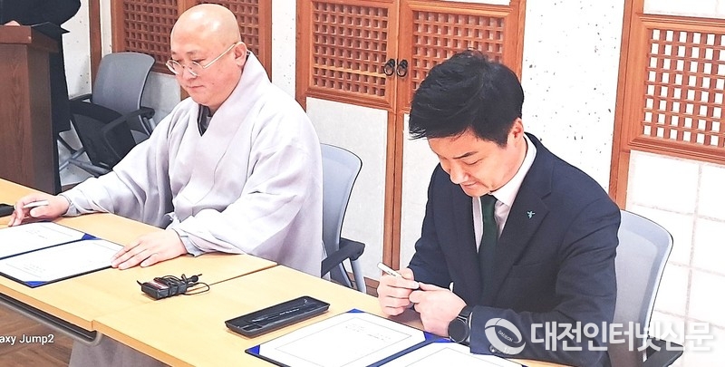 (좌) 탄대 관장스님과 (우)하나은행 대전·세종 영업본부 오세진 지역대표가 협약서에 서명을....[사진-대전인터넷신문]