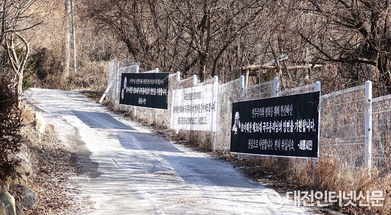 자택 입구에 게시된 애도 현수막이....[사진-대전인터넷신문]