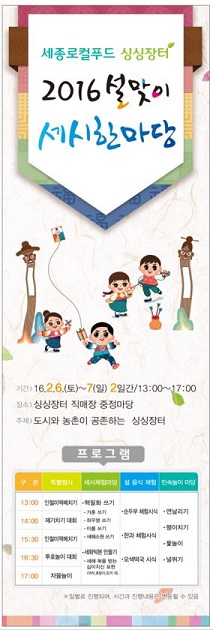 세종시 로컬푸드 직매장 1호점 `싱싱장터 도담도담´은 설을 맞아 6일부터 7일 오후 1시~오후 5시 `2016 싱싱장터 민속놀이한마당´을 개최한다.