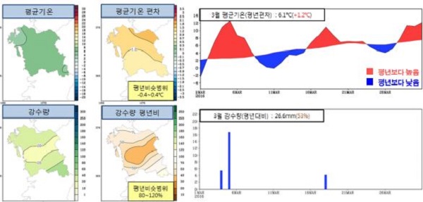 또한 서쪽에서 다가온 저기압의 영향으로 18일에는 평균 4.2mm의 비가 내렸으며 저기압이 주로 우리나라 남쪽으로 통과하면서 4~6일과 18일강수를 제외하고 비가 내리지 않았고 대전․세종․충남지방의 3월강수량은 평년대비 53%로 매우 적었음다.