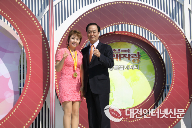▲ 전국노래자랑 세종특별자치시편에서 최우수상를 수상한 서명길(여 보람동)과 세종시 홍영섭 정무부시장이 기념 촬영을 하고있다.