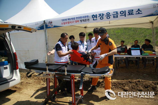 세종특별자치시(시장 이춘희)가`2016 재난대응 안전한국훈련´2일차인 17일 오전 연기면 세종리 소재 송암교에서 수질오염사고 대비 현장 훈련을 실시했다.