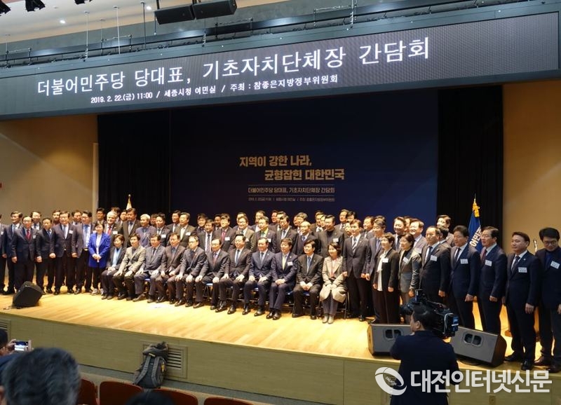 더불어민주당 소속 전국 기초단체장 100여명이 22일 세종특별자치시 여민실에서 간담회를 개최하고, 기재부 구윤철 2차관 및 행안부 윤종인 정부의 지역경제 활성화 추진방안 및 재정집행 추진계획을 경청하고 지역현안을 논의하였다. 사진은 더불어민주당 소속 전국기초단체장들이 한자리에 모여 그동안의 안부를 교환하고, 기념촬영을.... [사진-대전인터넷신문]