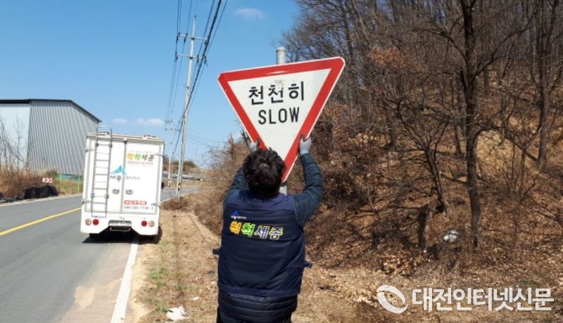 세종시 척척세종 생활민원기동처리반이 해빙기를 맞아 관내 표지판 등을 점검 하고 있다(사진-세종시청)