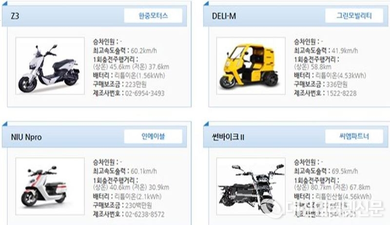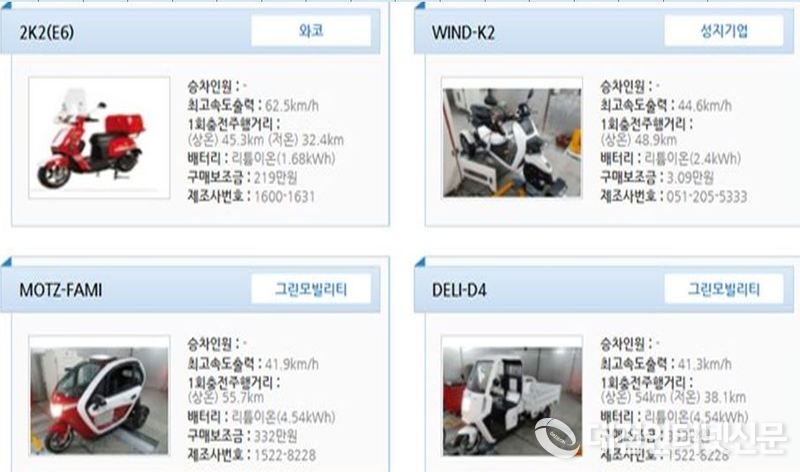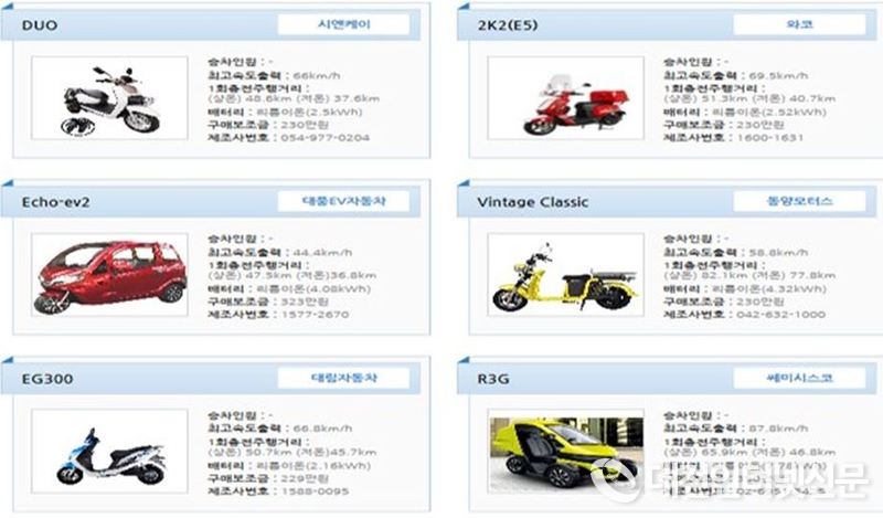 사진은 전기이륜차 보조금 지원 차종 [출처-전기차 구매보조금 지원시스템]