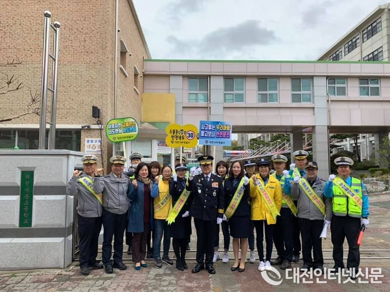 내동초등학교 앞에서 녹색어머니회, 모범운전자회, 교사, 학생, 교통경찰 등 스쿨존 어린이 교통사고 예방을 위한 안전활동 캠페인을 펼친 후 기념사진을 찍고 있다.(사진-대전청)