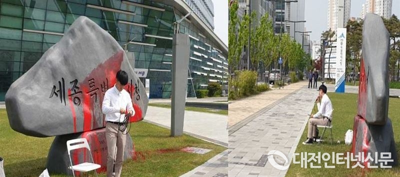 [대전 인터넷신문=세종/최대열 기자] 세종시청 앞에 세워진 박근혜 전 대통령의 친필 휘호가 적힌 표지석에 페인트를 뿌린 남성이 구속되는 사건이 1일 발생했다.