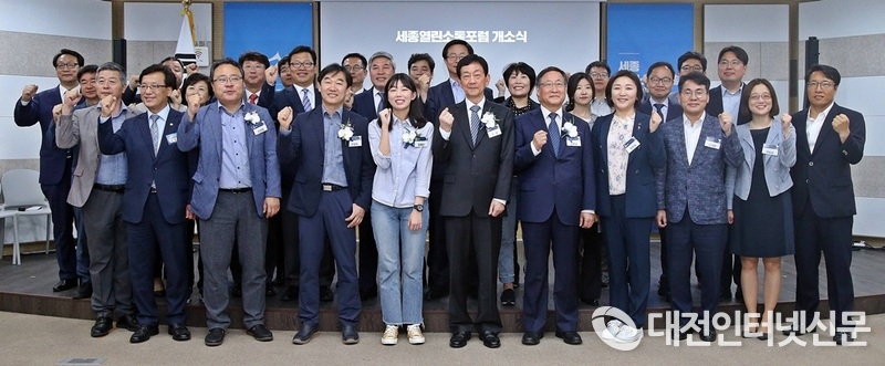 5월 17일 정부세종청사 종합안내동 1층에서 열린 '세종열린소통포럼 개소식'에 참석한 진영 장관(앞줄 가운데), 김병섭 정부혁신추진협의회 민간위원장(오른쪽 다섯번째), 정예은 국민대표(왼쪽 다섯번째) 등 관계자들이 기념촬영을 하고 있다. [사진-행정안전부]