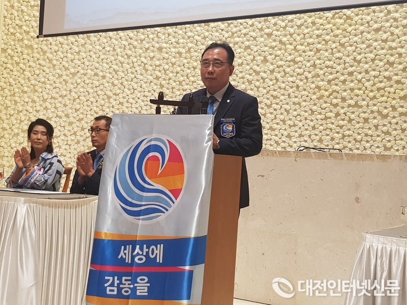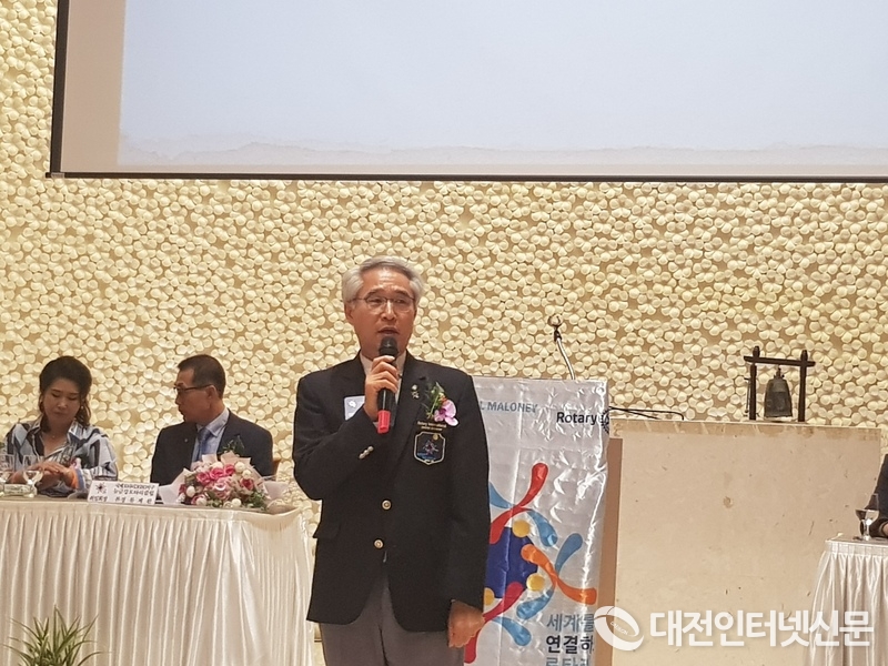 취임 축사를 하고 있는 3680지구(2019-2020) 소윤 이득용 총재(사진-대전 인터넷신문)