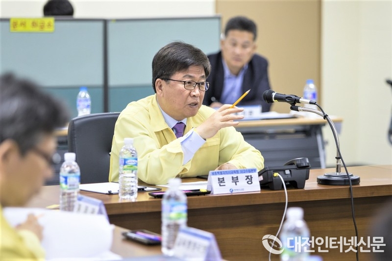 세종시교육청이 제 8호 태풍 ‘프란시스코’의 북상에 대비하여 관내 각급학교에 주의사항을 안내했다. 사진은 지난 6월 진행한 태극 을지연습 재난 발생 대비 사고수습본부 모의 구성 및 재난대응 연습에서 최교진 교육감이 발언을 하고 있다.(사진-세종시교육청)