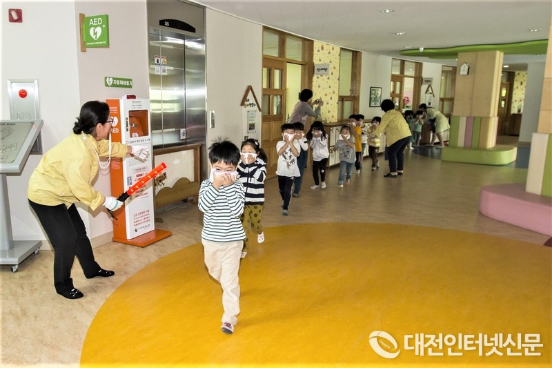 세종시 연세유치원 교직원과 원아들이 재난발생 대피 훈련을 실시하고 있는 장면(사진-세종시교육청)