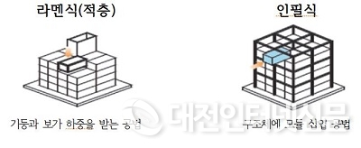 기존 적층식 공법과 인필식 공법의 차이.(사진-국토교통부)인필공법은 뼈대가 있는 구조체에 박스형태의 모듈을 서랍처럼 끼워넣는 방식으로, 기존에 적용되었던 적층식 모듈러 공법보다 층간소음 완화 및 구조안전성이 강화되고, 고층구조에도 적용이 용이한 장점을 가지고 있다.