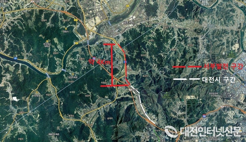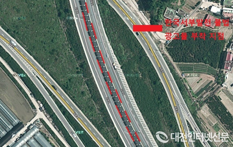 세종특별자치시로 들어오는 관문인 대전~세종간 광역 BRT도로 약 4Km구간에 불법설치된 32개 서부발전 간판이 미관을 해치고 있다. [사진-대전인터넷신문]