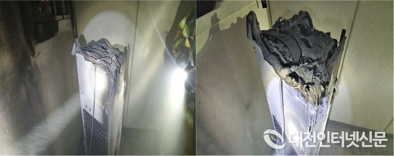 도담동 아파트 복도에 설치된 정수기에서 원인 미상의 화재가 발생 주민 50여 명이 대피하는 소동이 벌어진 화재현장. [사진-세종소방본부 제공]