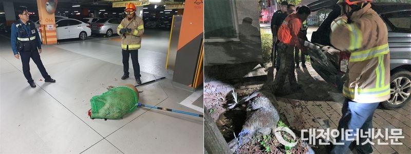 아파트 주차장에 출몰한 멧돼지를 포획하려는 소방대원과 포획 후 사살한 돼지를 처리하는 모습. [사진-세종소방본부 제공]