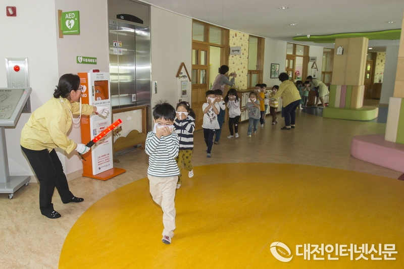 2018년 5월 세종시 연세초등학교 원아들이 2018년 재난대응 안전한국훈련 화재대피 훈련 참여하여 대피하고 있다.(사진-세종시교육청)