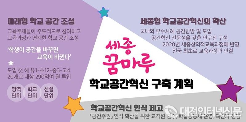 [대전인터넷신문=세종/김강원 기자] 세종시교육청이 유치원 1개소를 포함한 20개교를 학교공간혁신 대상 학교로 지정하고, 290억여 원을 투입, 학생들의 삶과 배움이 살아있는 미래형 학교공간으로 조성할 계획이다.